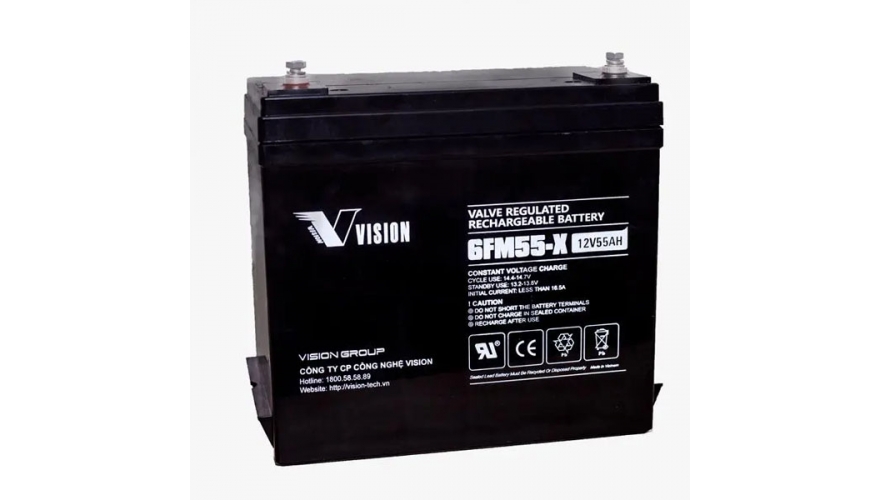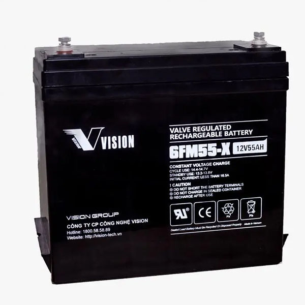 Vision 6FM55‑X là ắc-quy kín khí sử dụng công nghệ AGM (Absorbent Glass Mat), có dung lượng lớn 55 Ah và điện áp 12 V. Sản phẩm được thiết kế không cần bảo trì, phù hợp để bổ sung cho UPS, hệ thống chiếu sáng khẩn cấp, báo cháy, thiết bị y tế, viễn thông và các ứng dụng công nghiệp khác