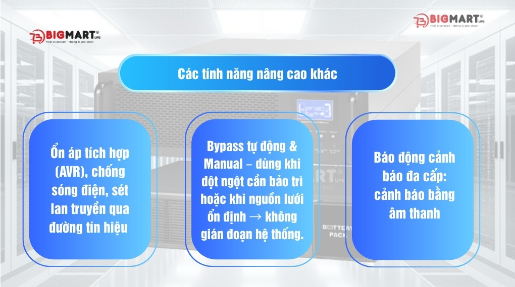 Bypass tự động & Manual – dùng khi đột ngột cần bảo trì hoặc khi nguồn lưới ổn định → không gián đoạn hệ thống.