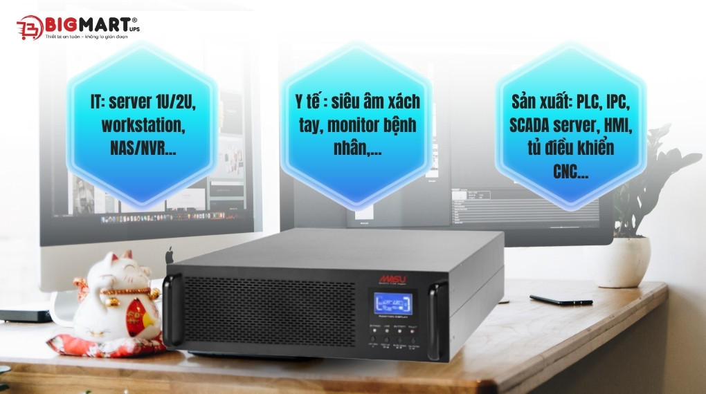 - Sản xuất: PLC, IPC, SCADA server, HMI, tủ điều khiển CNC (phần điều khiển), máy in tem; không khuyến nghị bơm/compressor lớn chung UPS.