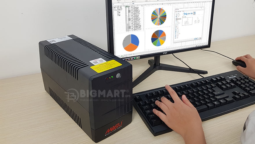Với công suất MS-2200VA/1200W thiết bị UPS dễ dàng cung cấp nguồn điện dự phòng mạnh mẽ cho 4 máy vi tính văn phòng (~250W/ 1 bộ) khoảng 1-2 phút đủ thời gian để lưu các dữ liệu quan trọng trên máy.