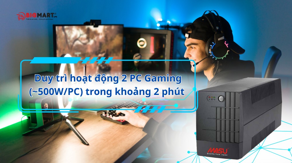 Bộ lưu điện có công suất lên đến 2200VA phù hợp để duy trì hoạt động 2 PC Gaming (~500W/PC) trong khoảng 2 phút đủ thời gian để tắt máy an toàn.