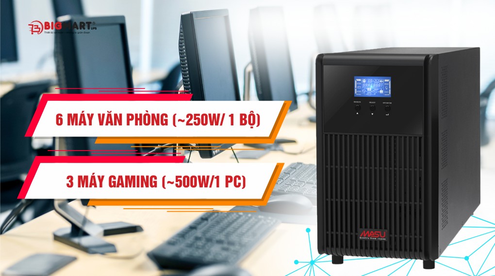 - Dùng cho văn phòng: 6 máy vi tính văn phòng (~250W/ 1 bộ) khoảng 2-3 phút đủ thời gian để lưu các dữ liệu quan trọng trên máy.