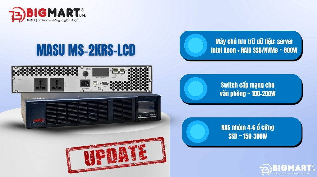 Ví dụ, một máy chủ phổ thông dùng CPU Intel Xeon và hai ổ cứng SSD tiêu thụ khoảng 500W, khi kết hợp cùng switch gigabit (50W) và NAS nhỏ (200W), tổng tải vào khoảng 750W – hoàn toàn phù hợp với công suất 1800W của MS‑2KRS LCD, thậm chí thiết bị có thể dùng cho cùng lúc 2 máy chủ phổ thông.