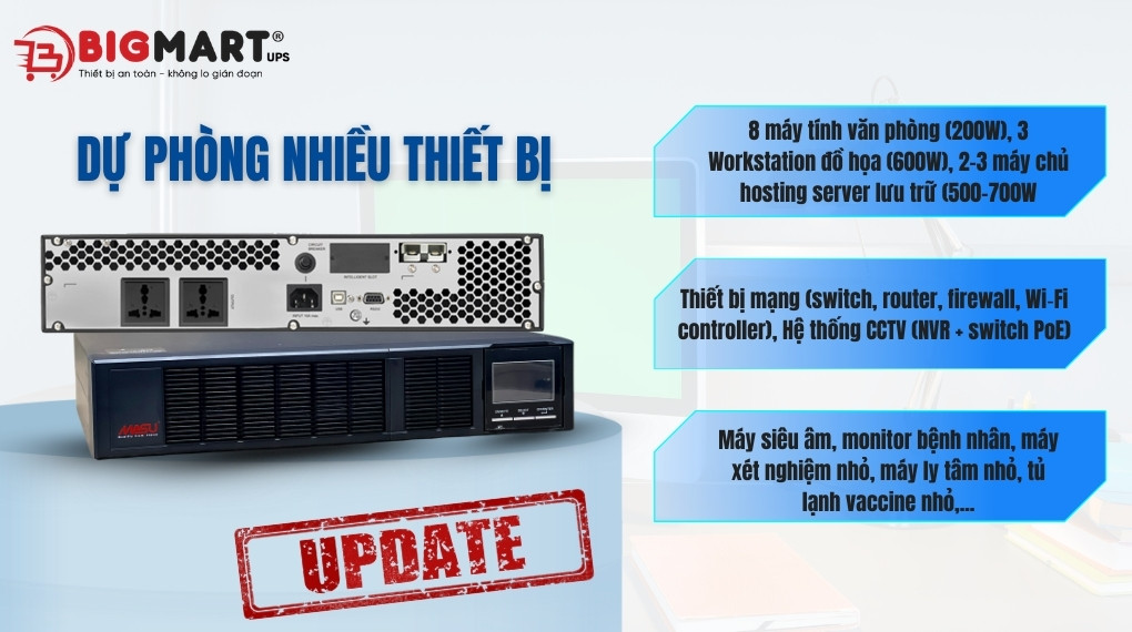 Hoặc tích hợp UPS cho 1 hệ thống máy tính, thiết bị mạng trong văn phòng mini gồm: 2×Workstation (2×600W) + 1×Switch PoE (370W) + NAS (80W) + Router (40W) → ~1690W (~62%).