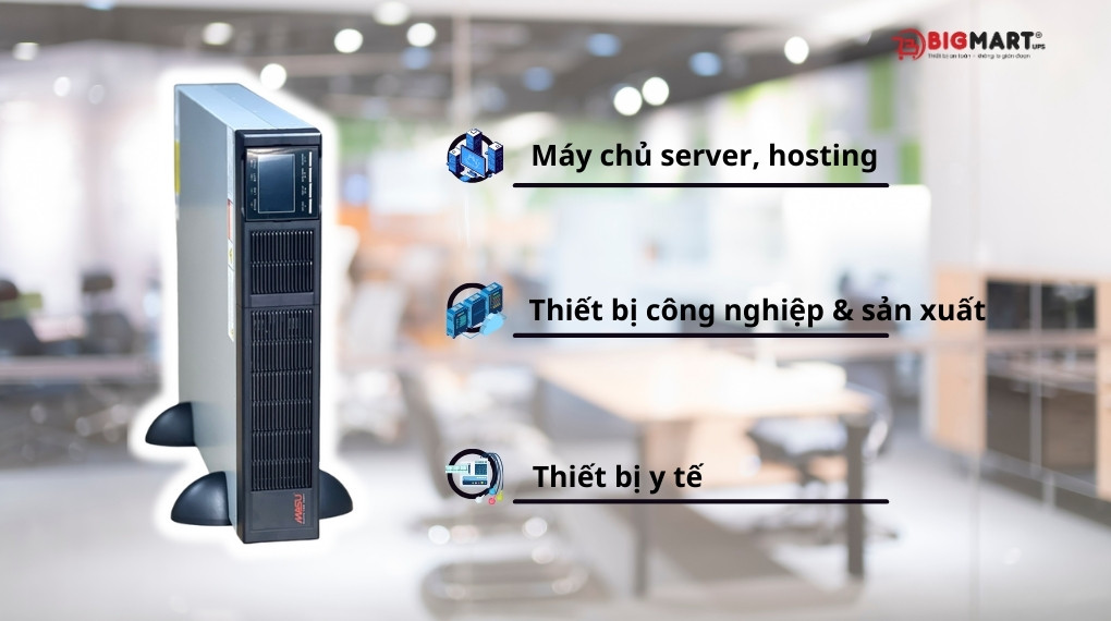 - Máy chủ server, hosting: Một bộ lưu điện UPS 6kVA có thể tương thích với hệ thống 4-5 máy chủ lưu trữ, xử lý dữ liệu quan trọng, duy trì hoạt động trong thời gian 2-3 phút khi xảy ra sự cố điện, giúp tắt an toàn và kích hoạt phương án dự phòng.