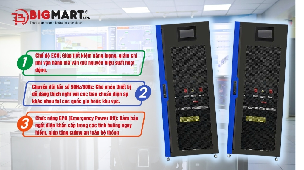 Chức năng EPO (Emergency Power Off): Đảm bảo ngắt điện khẩn cấp trong các tình huống nguy hiểm, giúp tăng cường an toàn hệ thống.
