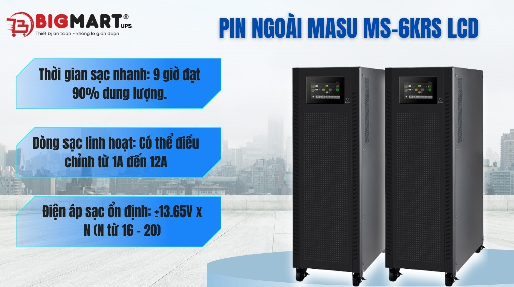 Masu MSI33 – 30KS sử dụng ắc quy mở rộng ngoài, hỗ trợ dung lượng lên đến 250Ah. Quý khách có thể dễ dàng tùy chỉnh thời gian lưu điện mong muốn theo số lượng ắc quy dung lượng 5Ah-200Ah. Siêu thị bộ lưu điện cung cấp ắc quy ups chính hãng Vision, Long, Globe, GS.
