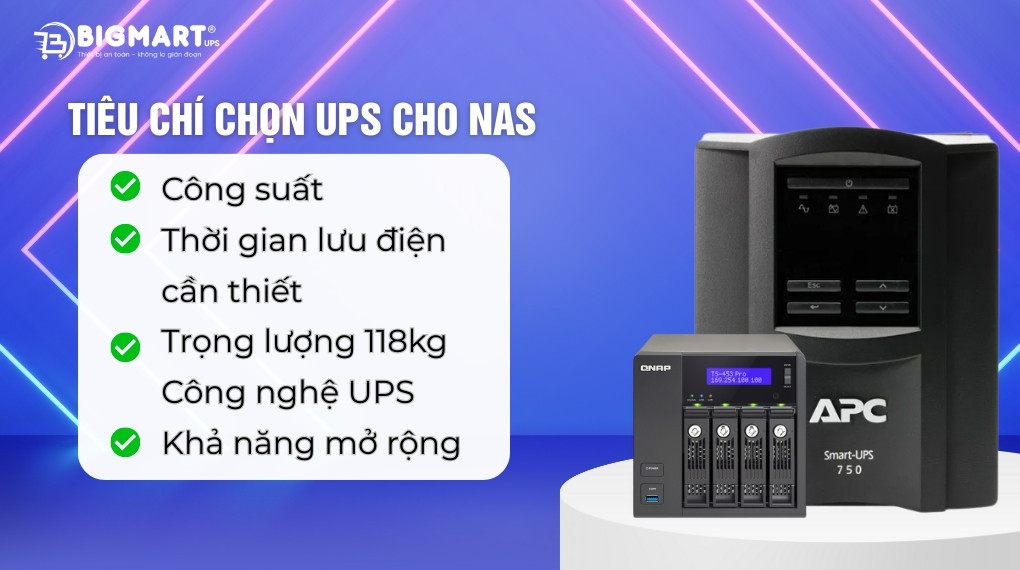 Bộ lưu điện lựa chọn cho hệ thống NAS và các thiết bị đi kèm nên để trang bị module pin ngoài để tăng thêm runtime, có khe mở rộng ( SmartSlot, USB, RS‑232,...) để có thể quản lý từ xa. Ngoài ta lựa chọn bộ lưu điện chất lượng có chế độ ECO để tăng hiệu suất khi tải nhẹ.